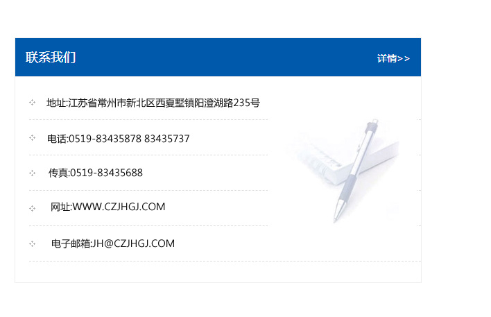 傳真:0519-83435688    郵編:213135    網(wǎng)址:WWW.czjhgj_com.wanjiawuliou.com    電子郵箱:JH@czjhgj_com.wanjiawuliou.com